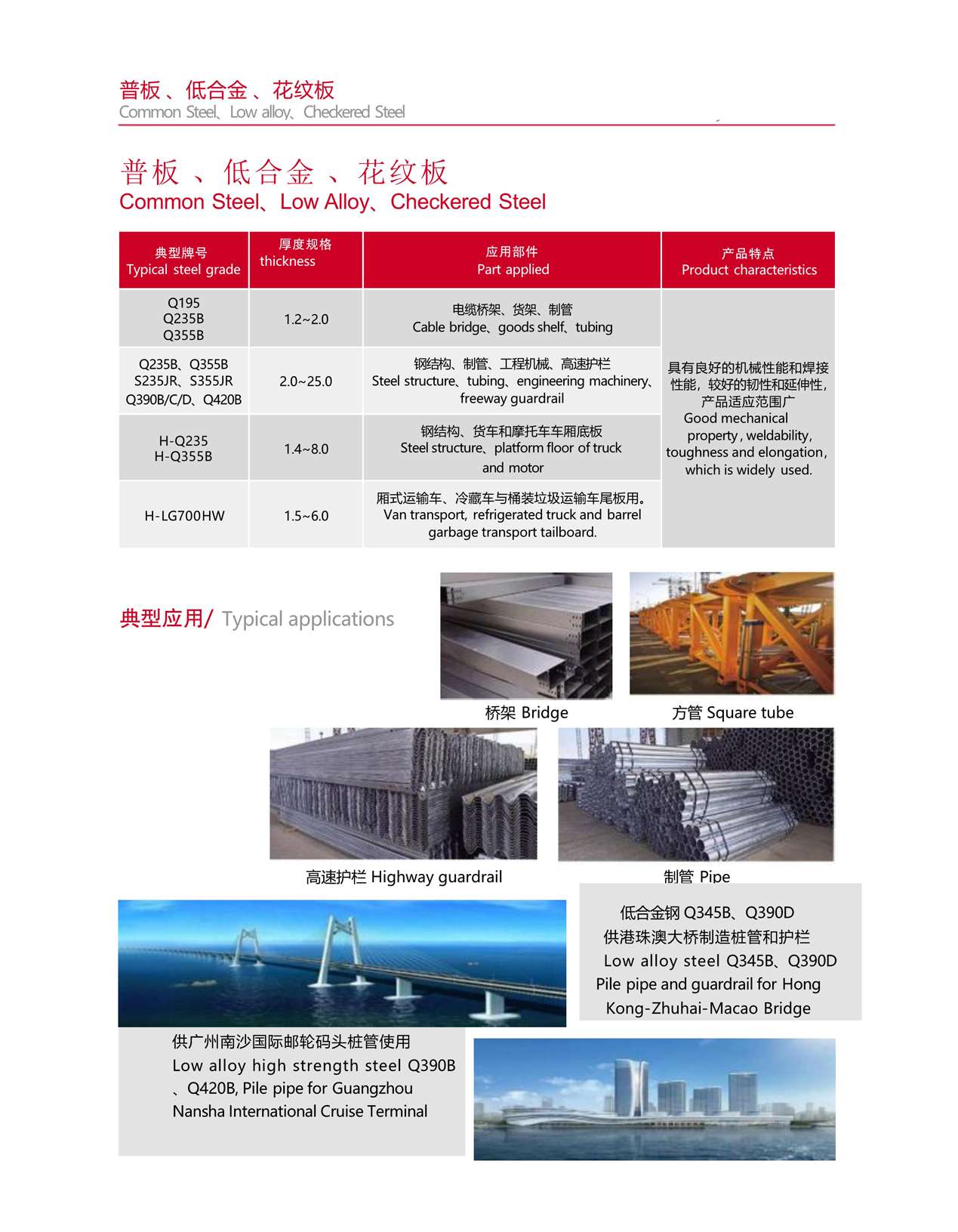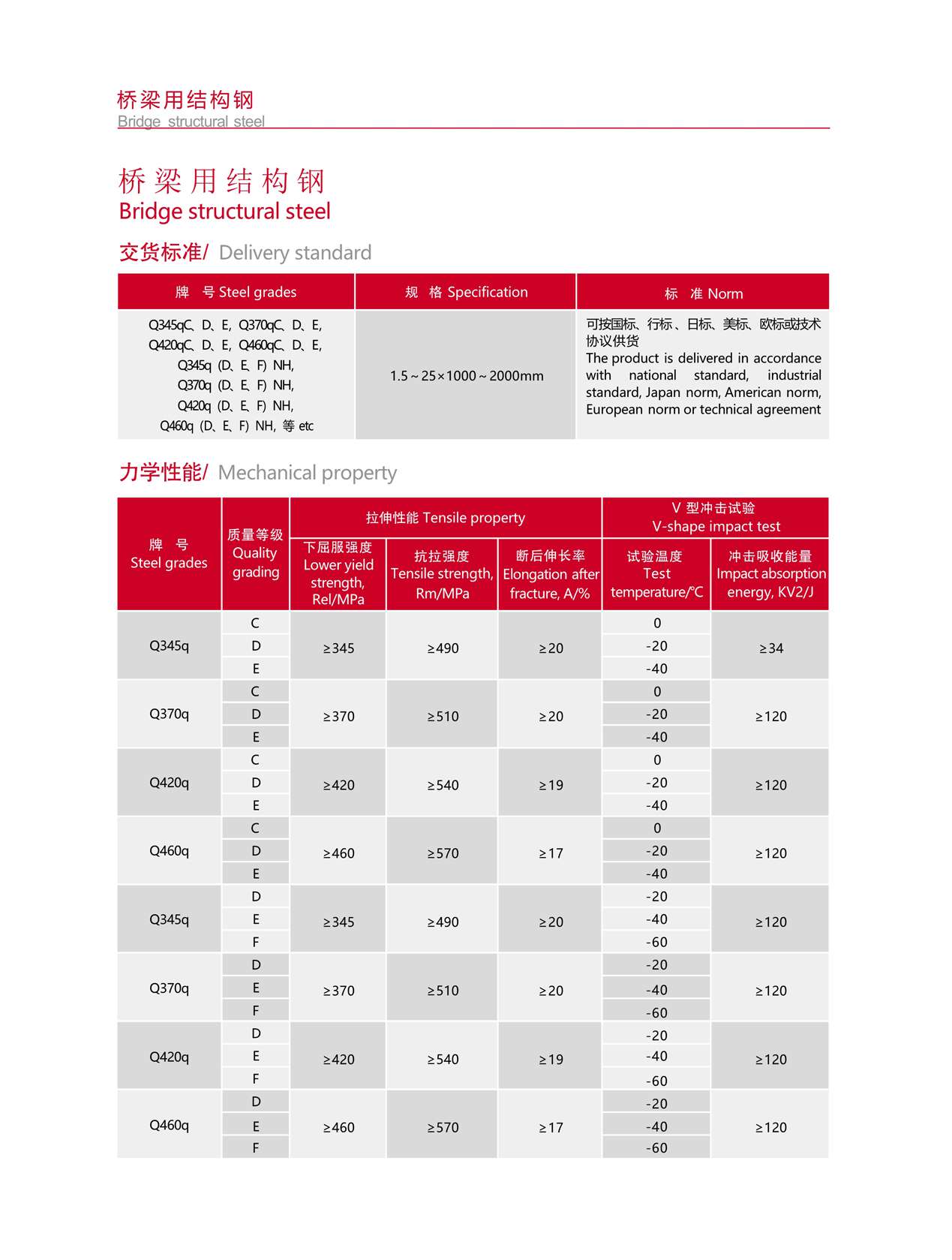 桥梁钢具有较高的强度、韧性以及承受机车车辆的载荷和冲击,有良好的抗疲劳性、一定的低温韧性和耐大气腐蚀性,钢材的表面质量要求较高;公司可供Q345~Q460强度等级桥梁及耐候桥梁钢,可按国标、行标、日标、美标、欧标或技术协议供货。