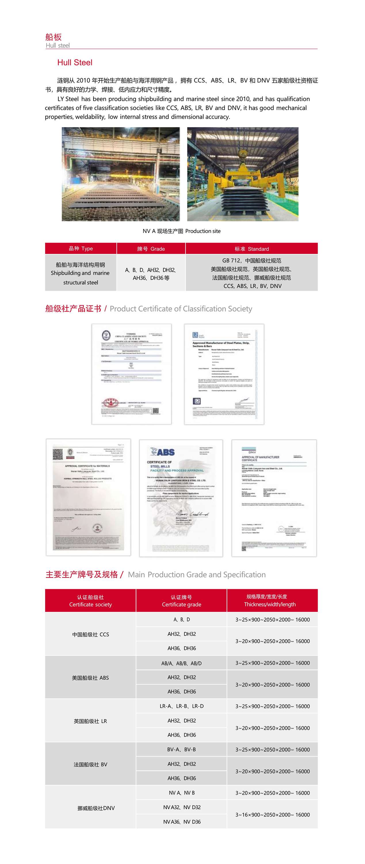 生产船舶与海洋用钢产品 ,拥有 CCS、ABS、LR、BV 和 DNV 五家船级社资格证书,具有良好的力学、焊接、低内应力和尺寸精度。