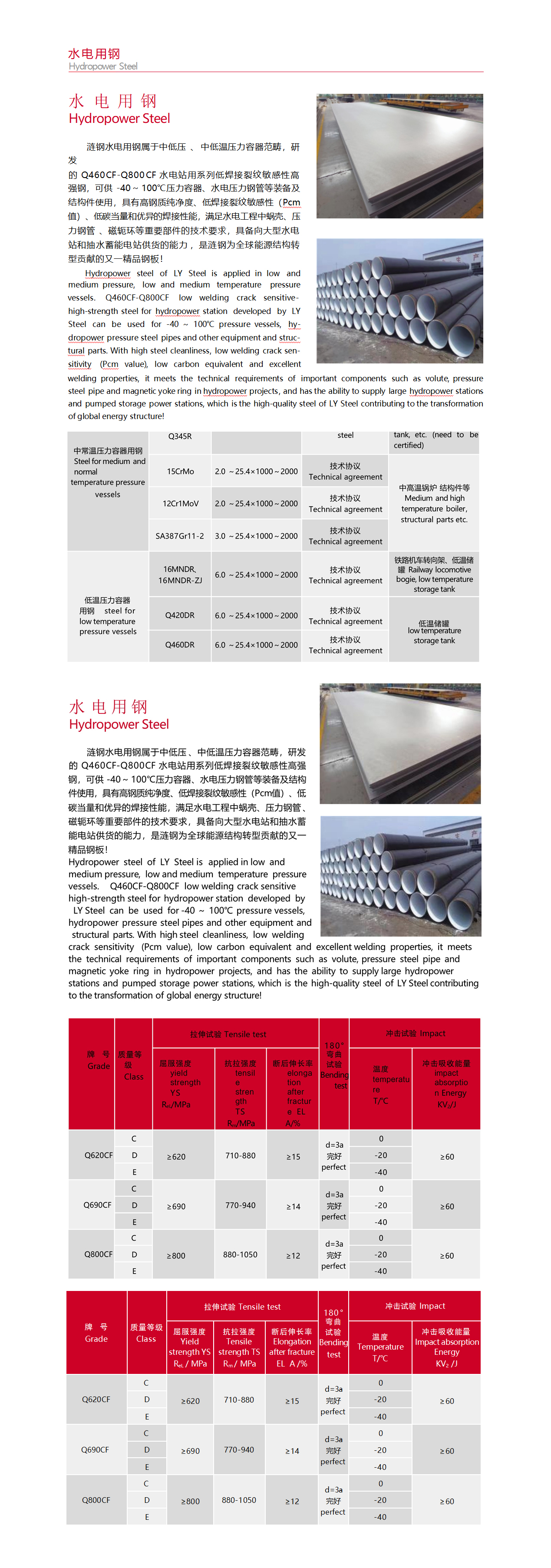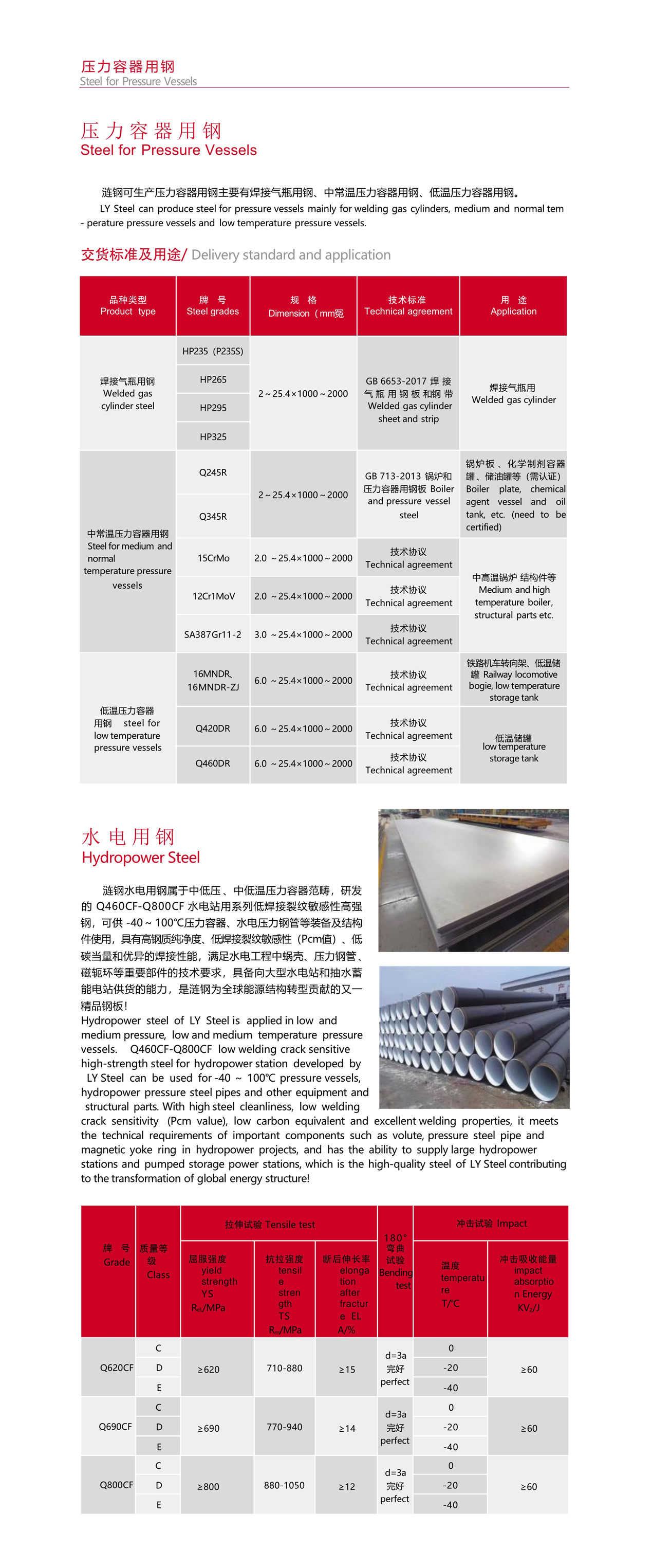 中低压 、中低温压力容器范畴,研发的Q460CF-Q800CF水电站用系列低焊接裂纹敏感性高强钢,可供-40~100℃压力容器、水电压力钢管等装备及结构件使用,具有高钢质纯净度、低焊接裂纹敏感性(Pcm值)、低碳当量和优异的焊接性能,满足水电工程中蜗壳、压力钢管 、磁轭环等重要部件的技术要求,具备向大型水电站和抽水蓄能电站供货的能力,一款精品钢板!