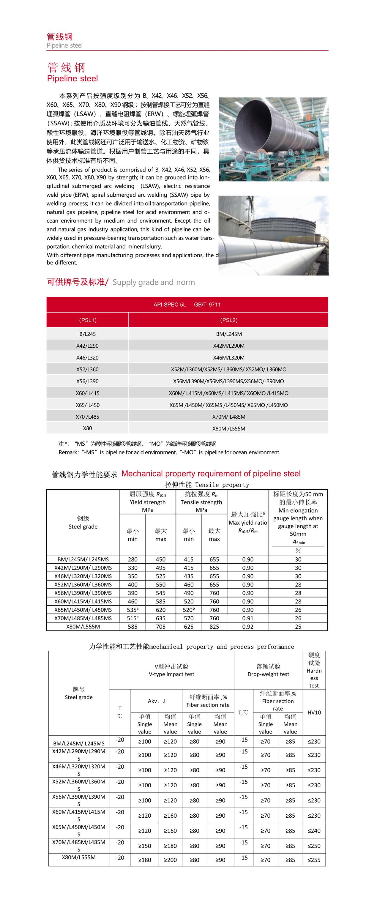 本 系 列 产 品 按 强 度 级 别 分 为 B、X42、X46、X52、X56、X60、X65、X70、X80、X90 钢级 ;按制管焊接工艺可分为直缝埋弧焊管(LSAW)、直缝电阻焊管(ERW)、螺旋埋弧焊管(SSAW);按使用介质及环境可分为输油管线、天然气管线、酸性环境服役、海洋环境服役等管线钢。