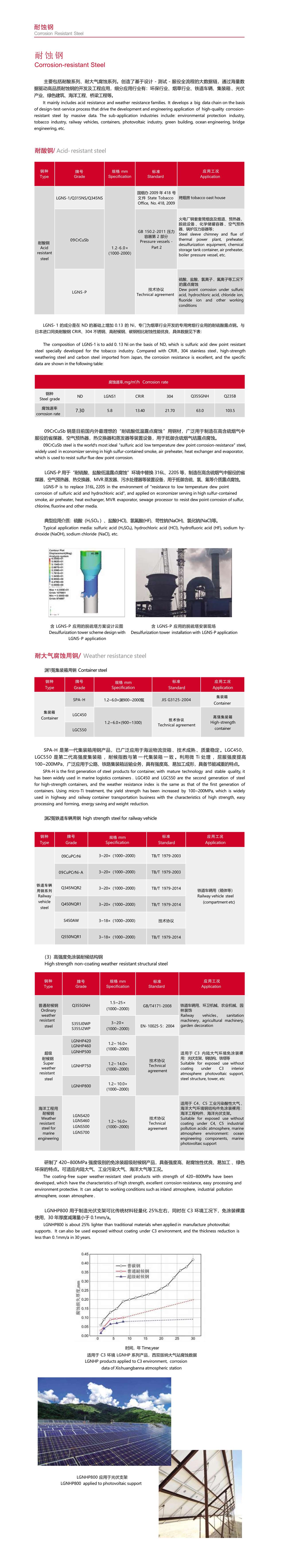 主要包括耐酸系列、耐大气腐蚀系列。创造了基于设计 - 测试 - 服役全流程的大数据链,通过海量数 据驱动高品质耐蚀钢的开发及工程应用,细分应用行业有:环保行业、烟草行业、铁道车辆、集装箱 、光伏 产业、绿色建筑、海洋工程、桥梁工程等。