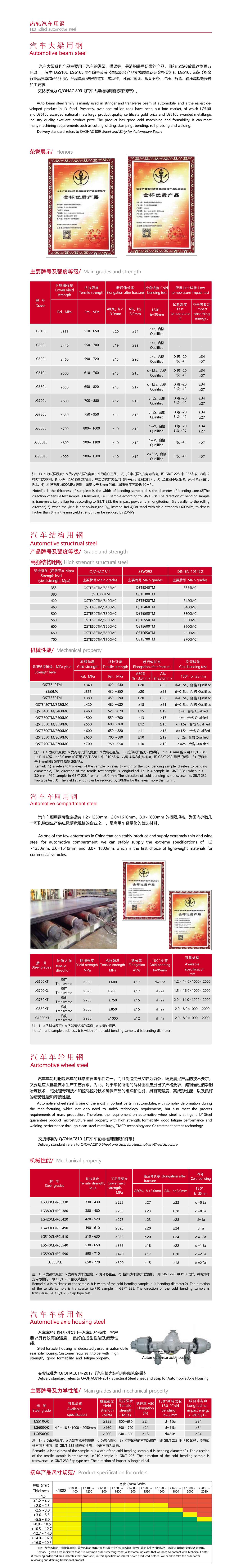 汽车大梁系列产品主要用于汽车的纵梁、横梁等,是涟钢最早研发的产品,目前市场投放量达到百万 吨以上,其中 LG510L LG610L 两个牌号荣获《国家冶金产品实物质量认证金杯奖》和 LG510L 荣获《冶金 行业品质卓越产品》奖。产品具有良好的冷加工成型性,可满足剪切、纵切分条、冲压、折弯、辊压焊接等多种 加工要求。