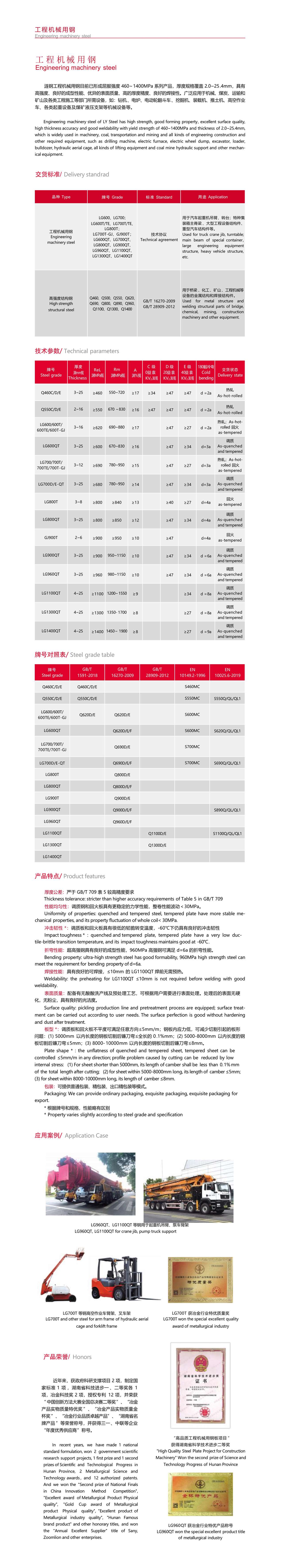 用钢目前已形成屈服强度 460~ 1400MPa 系列产品,厚度规格覆盖 2.0~25 .4mm,具有 高强度、良好的成型性能、优异的表面质量、高的厚度精度、良好的焊接性。广泛应用于机械、煤炭、运输和 矿山及各类工程施工等部门所需设备,如:钻机 、电炉、电动轮翻斗车 、挖掘机、装载机、推土机、高空作业 车、各类起重设备及煤矿液压支架等机械设备等。