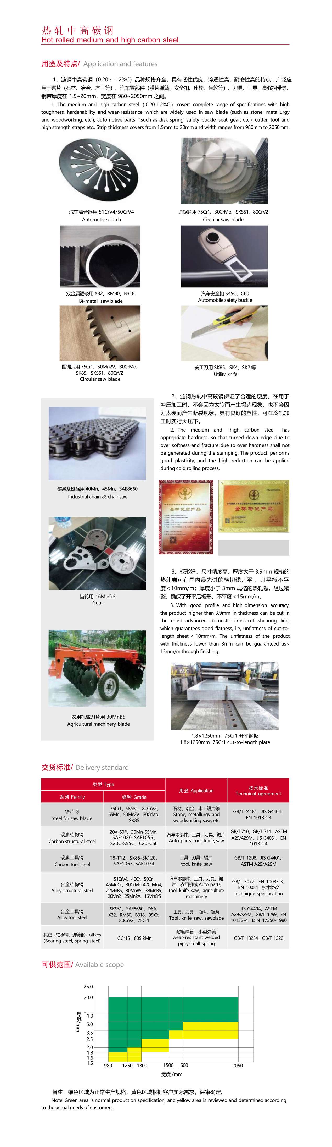 热轧中高碳钢(0.20~ 1.2%C)品种规格齐全,具有韧性优良、淬透性高、耐磨性高的特点,广泛应 用于锯片(石材、冶金、木工等)、汽车零部件(膜片弹簧、安全扣、座椅、齿轮等)、刀具、工具、高强捆带等。 钢带厚度在 1.5~20mm,宽度在 980~2050mm 之间。