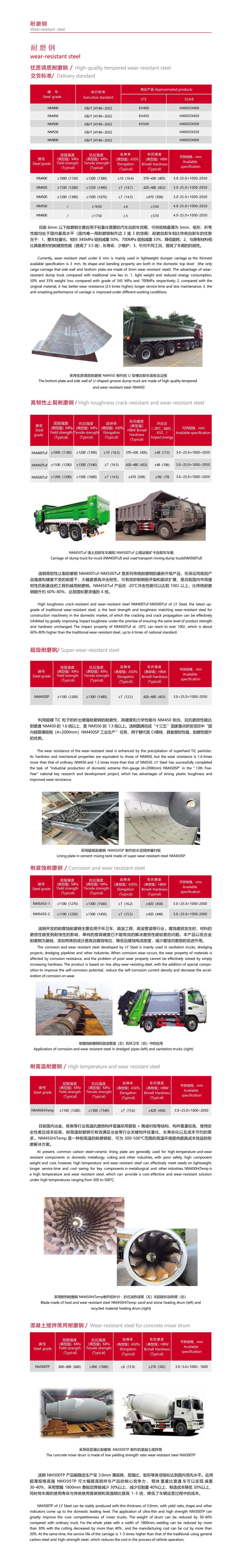 高韧性止裂耐磨钢 NM400Tuf-NM500Tuf 是系列传统耐磨钢的最新升级产品,在保证同级别产 品强度和硬度不变的前提下,大幅度提高冲击韧性,可有效抑制钢板开裂和裂纹扩展,是目前国内市场强 韧性匹配最佳的工程机械用耐磨钢。NM450Tuf 产品在 -20℃冲击性能可以达到 100J 以上,比传统耐磨 钢提升约 60%-80%,达到国标要求值的 4 倍。