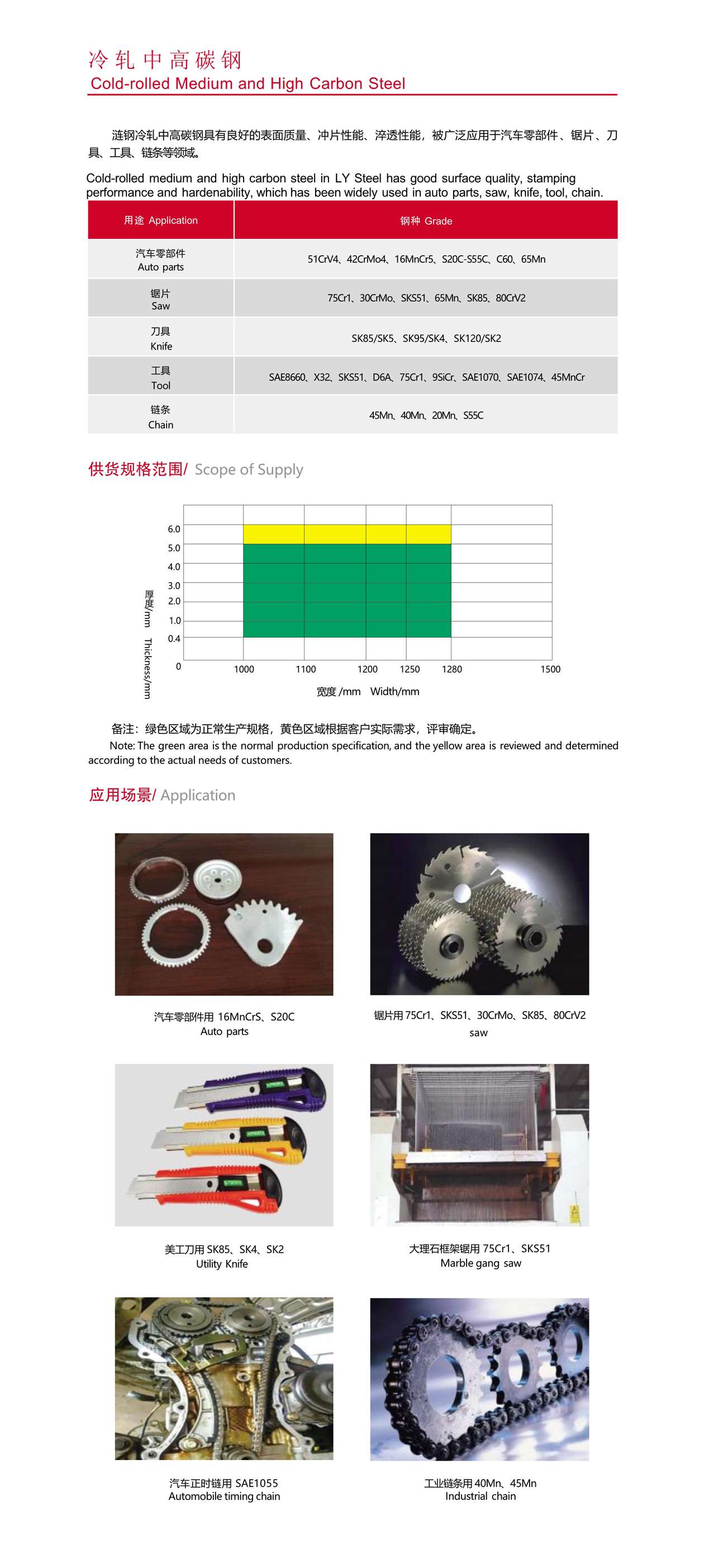 冷轧中高碳钢具有良好的表面质量、冲片性能、淬透性能,被广泛应用于汽车零部件 、锯片 、刀 具、工具、链条等领域。