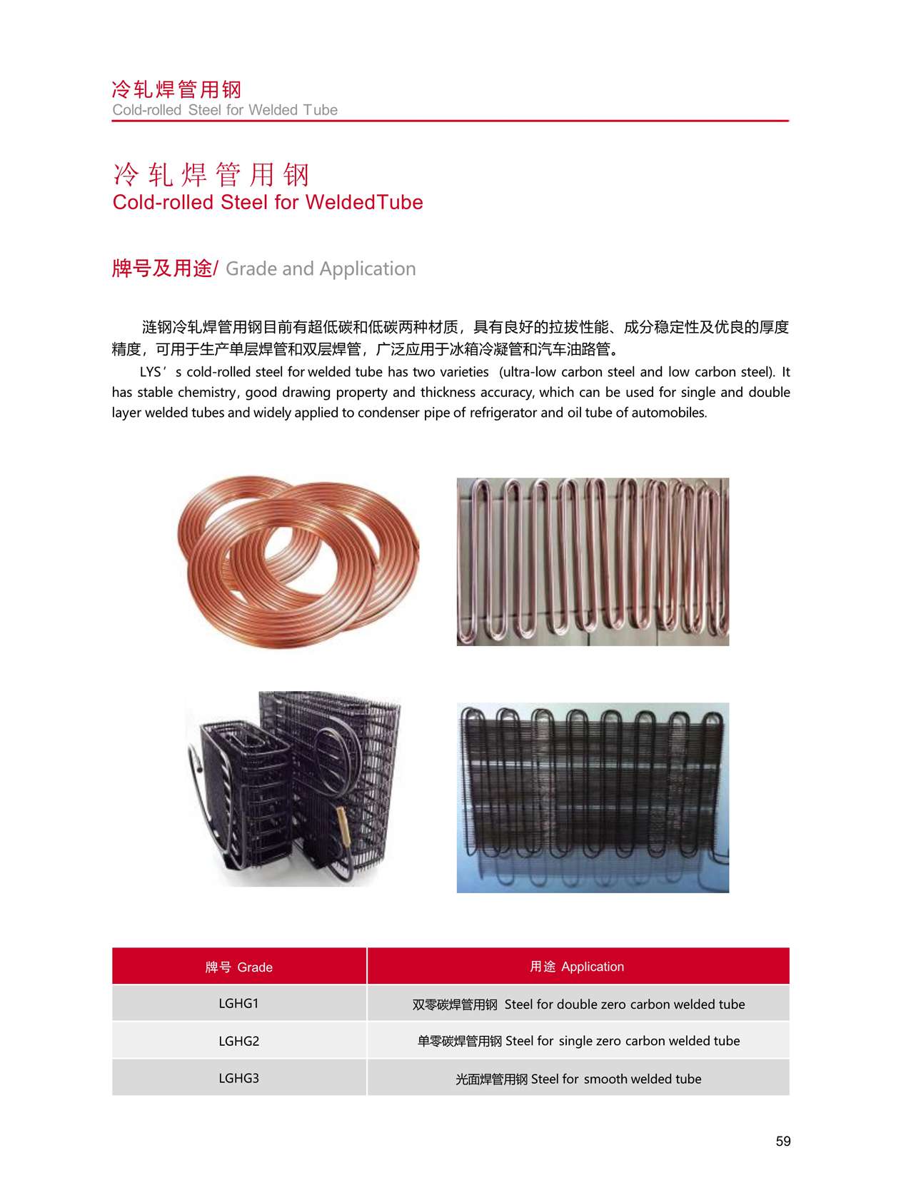 冷轧焊管用钢目前有超低碳和低碳两种材质,具有良好的拉拔性能、成分稳定性及优良的厚度 精度,可用于生产单层焊管和双层焊管,广泛应用于冰箱冷凝管和汽车油路管。