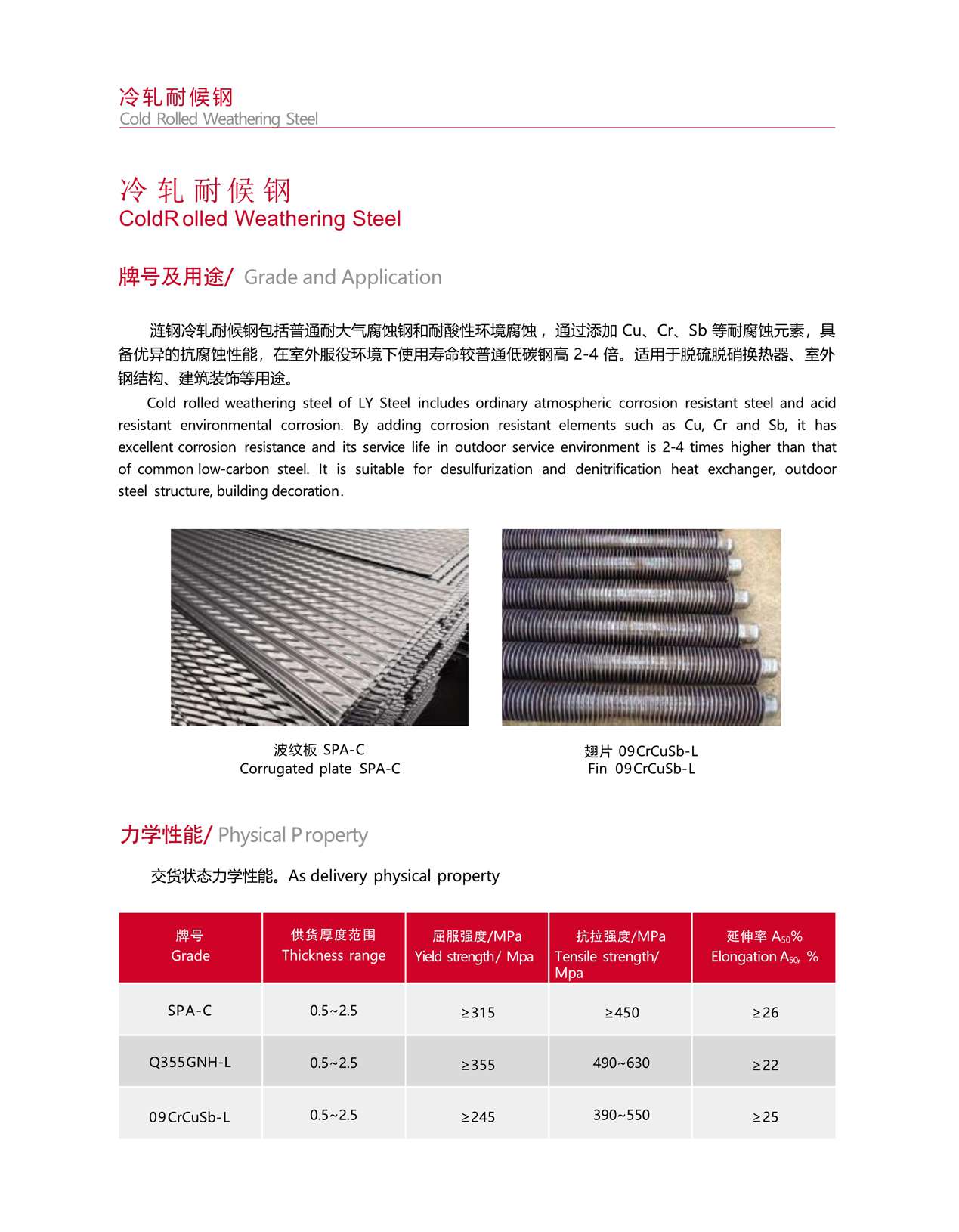 冷轧耐候钢包括普通耐大气腐蚀钢和耐酸性环境腐蚀 ,通过添加 Cu、Cr、Sb 等耐腐蚀元素,具 备优异的抗腐蚀性能,在室外服役环境下使用寿命较普通低碳钢高 2-4 倍。适用于脱硫脱硝换热器、室外 钢结构、建筑装饰等用途。