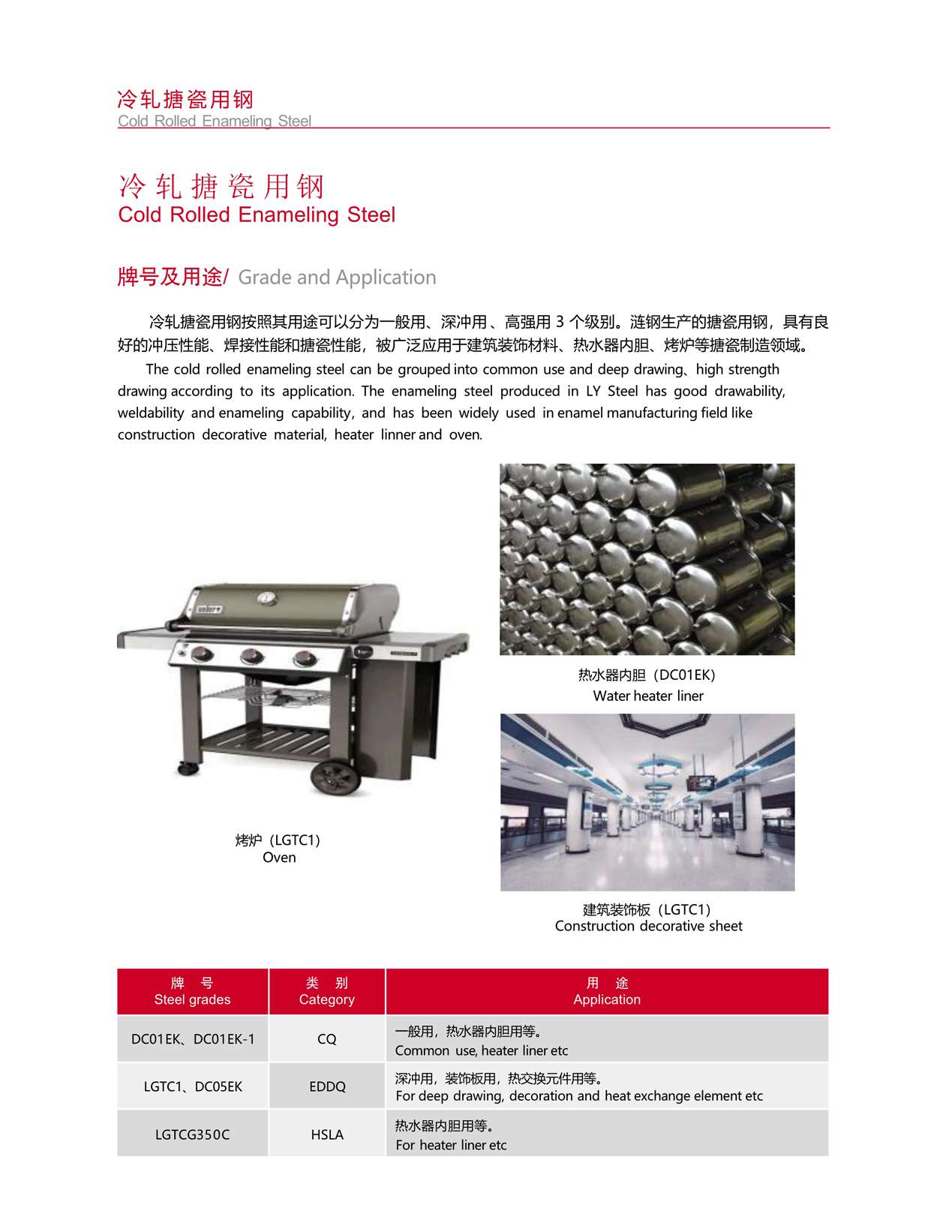 冷轧搪瓷用钢按照其用途可以分为一般用、深冲用 、高强用 3 个级别。涟钢生产的搪瓷用钢,具有良好的冲压性能、焊接性能和搪瓷性能,被广泛应用于建筑装饰材料、热水器内胆、烤炉等搪瓷制造领域。