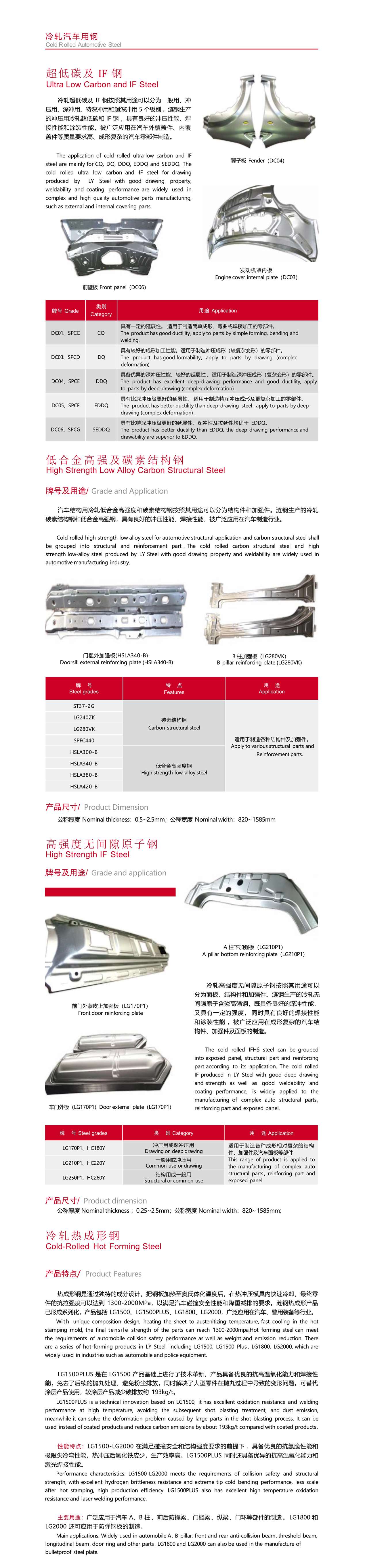 冷轧超低碳及 IF 钢按照其用途可以分为一般用、冲压用、深冲用、特深冲用和超深冲用 5 个级别 。涟钢生产的冲压用冷轧超低碳和 IF 钢 ,具有良好的冲压性能、焊接性能和涂装性能,被广泛应用在汽车外覆盖件、内覆盖件等质量要求高、成形复杂的汽车零部件制造。
