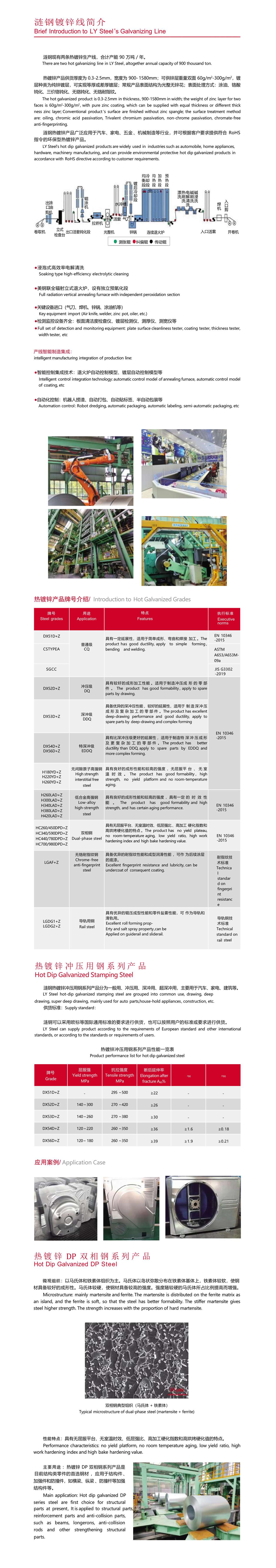 热镀锌产品供货厚度为 0.3-2.5mm,宽度为 900- 1580mm;可供锌层重量双面 60g/m2-300g/m2,镀 层种类为纯锌镀层,可实现等厚或差厚镀层;常规产品表面结构为光整无锌花;表面处理方式:涂油、铬酸 钝化、三价铬钝化、无铬钝化、无铬耐指纹。